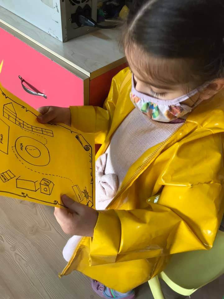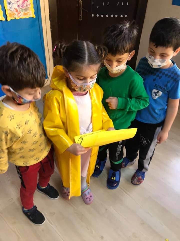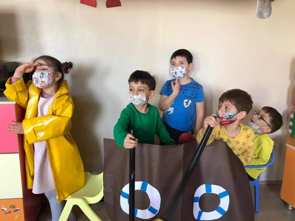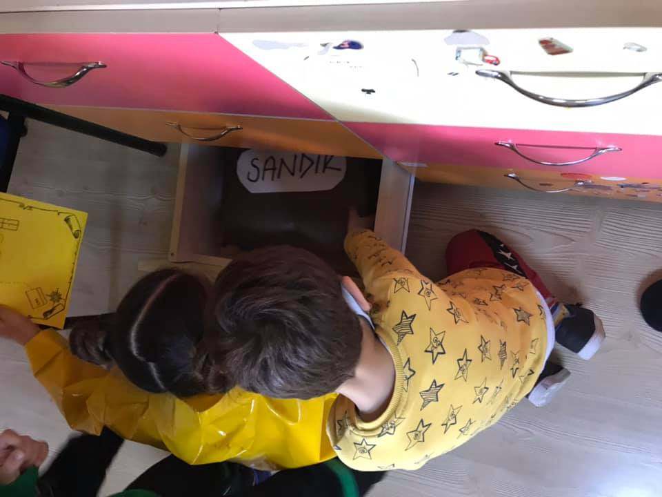 Kaptan ve Hazine avı draması yaparak mekanda konum bulma becerisi eğlenerek geliştirildi . Kaptan tayfalarını yönetip elindeki haritanın yönlendirmesiyle hazine sandığını bulmaya çalıştı. Her çocuğa kaptan rolü ve farklı bir harita verildi. ![]()
